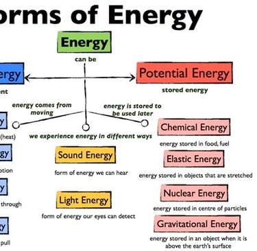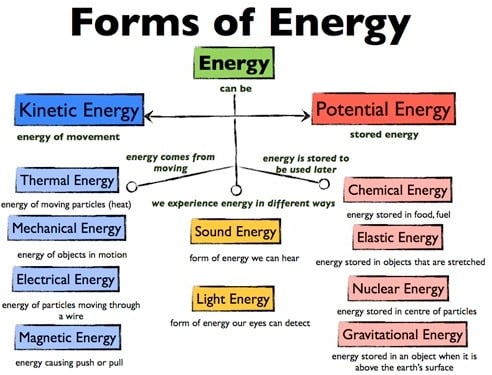Heat, Light, Sound, Electrical, Kinetic (movement), Elastic, Gravitational potential, Nuclear, and Chemical.